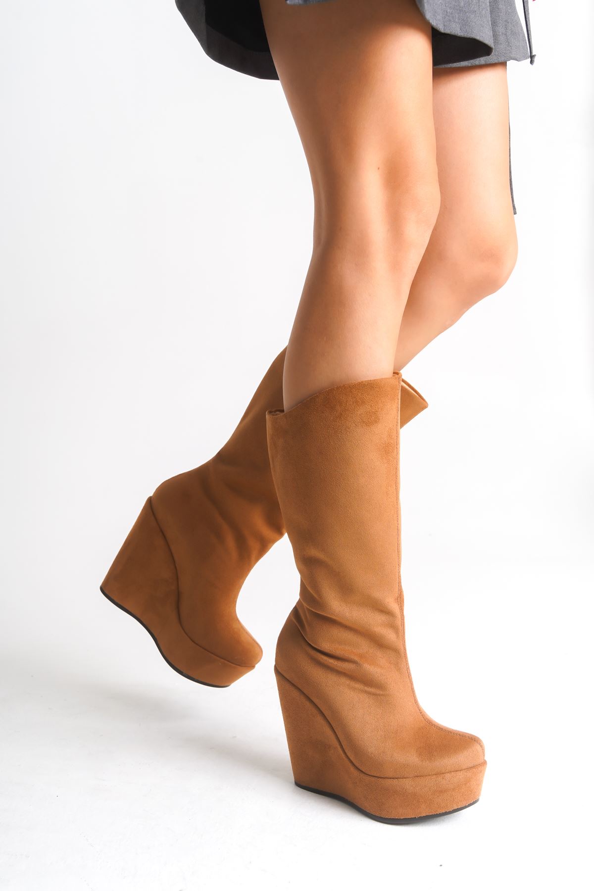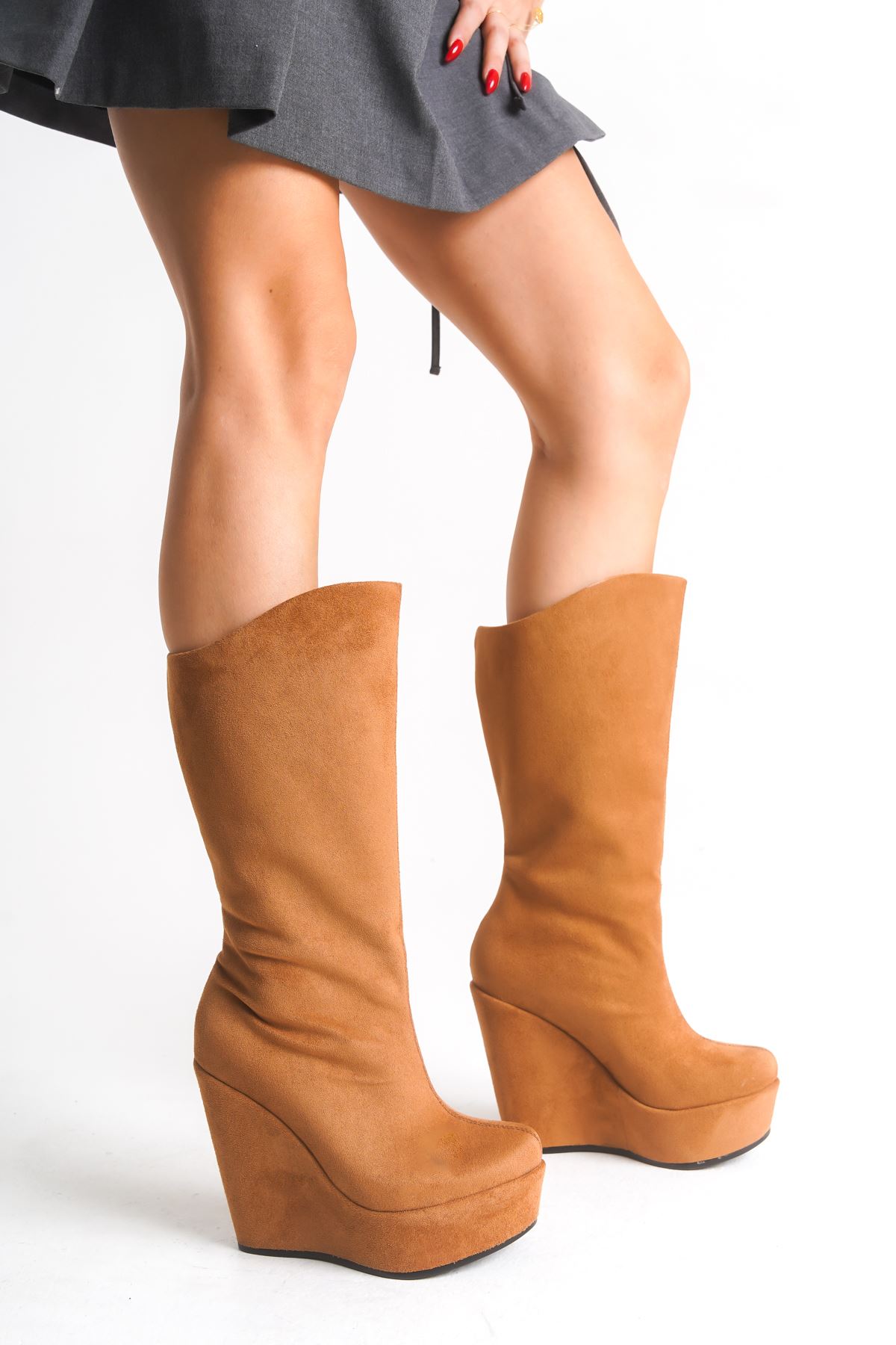 Beatrice ; Taba Süet ,12 cm Fermuarsız 12 Cm Dolgu Topuklu Kadın Çizme