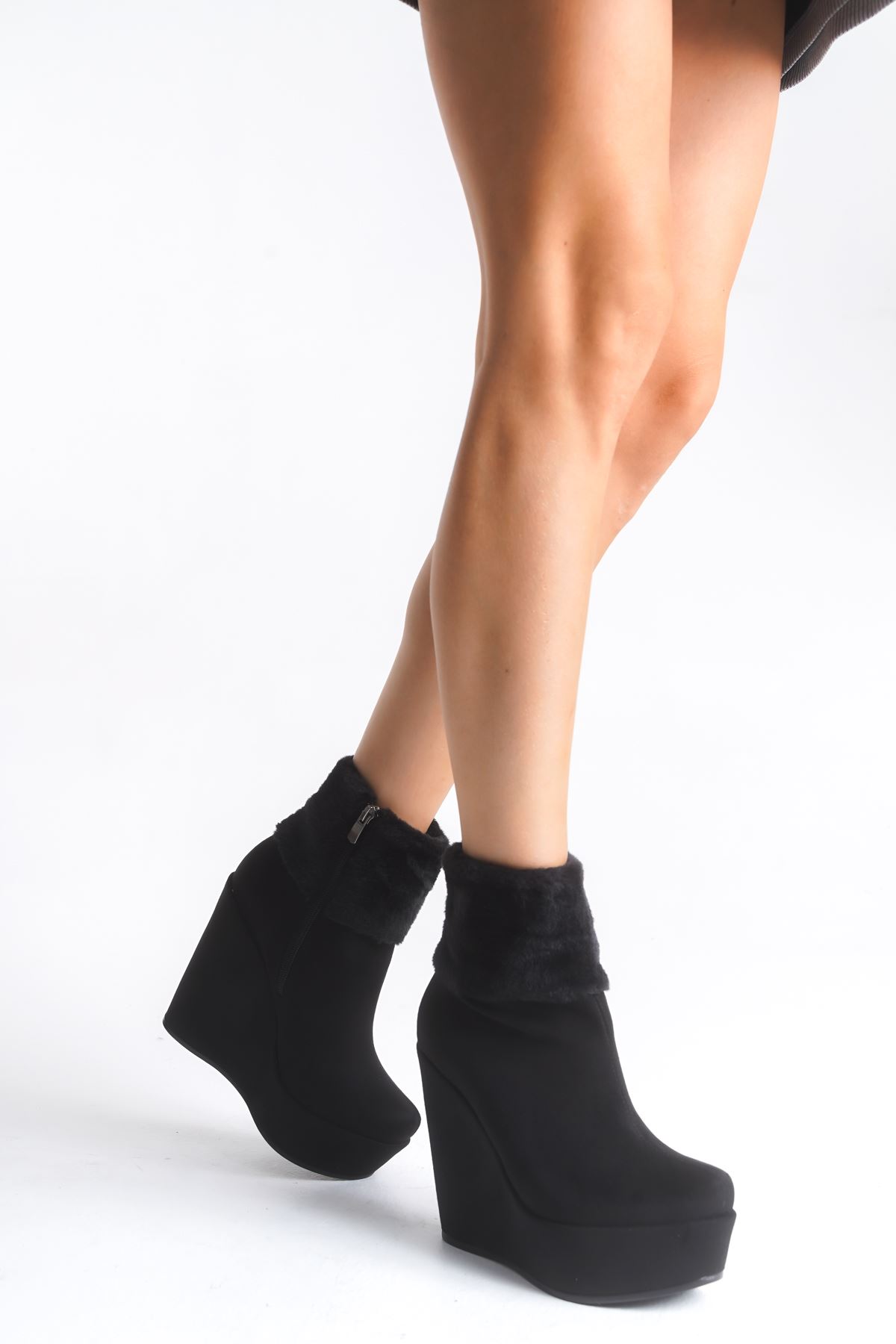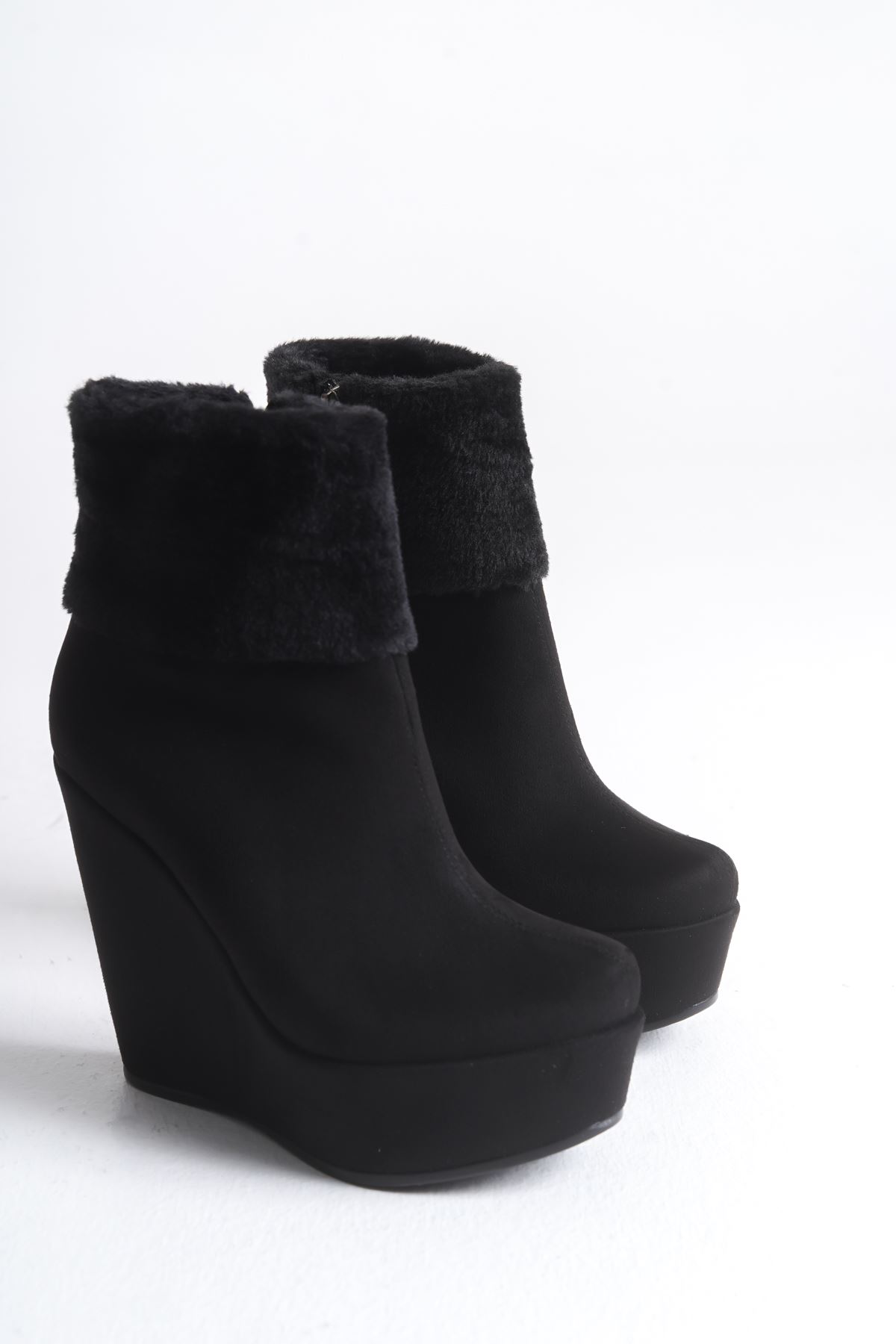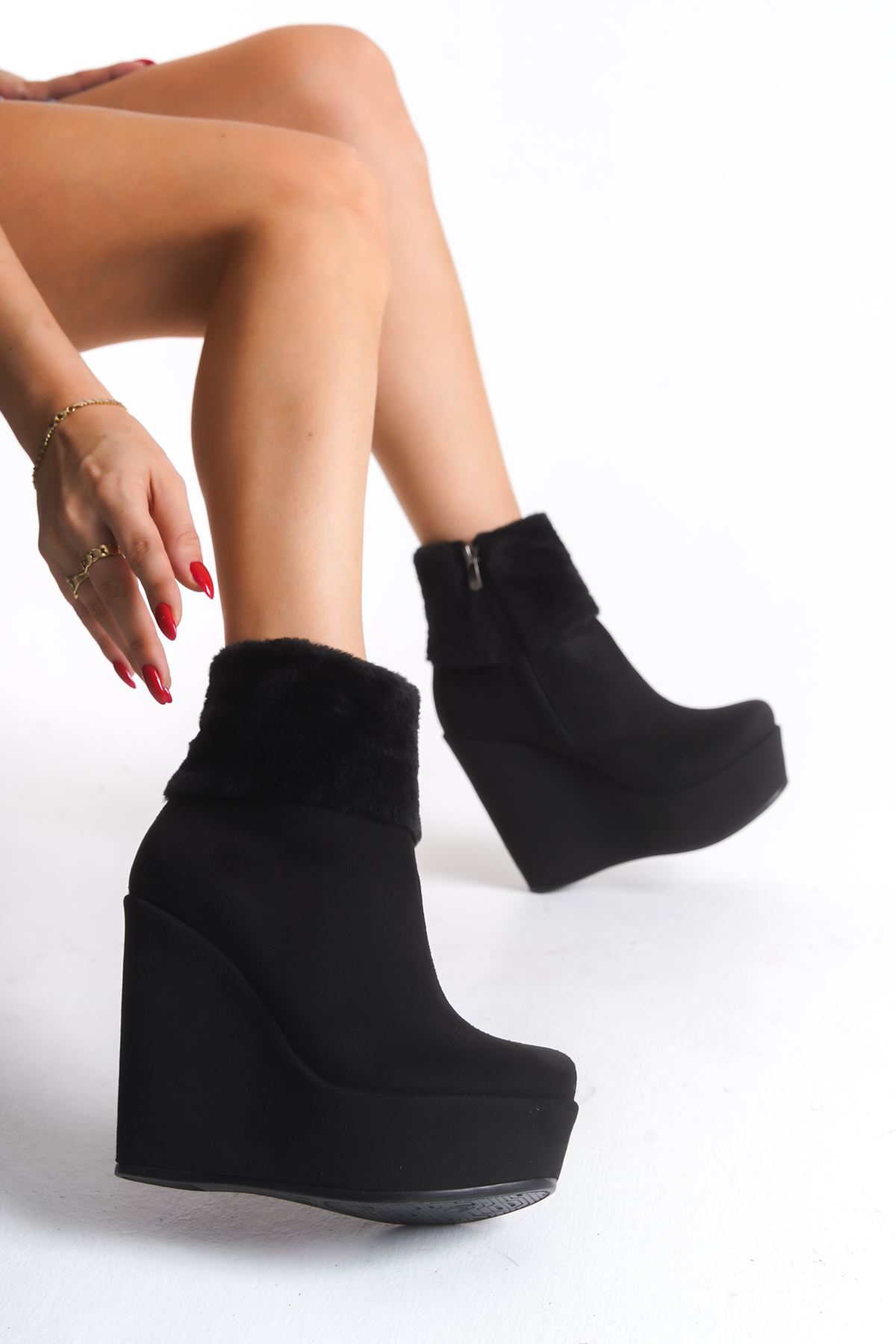 Eve ; Siyah Süet Kürk Detaylı,12 cm Dolgu Topuklu Kadın Bot